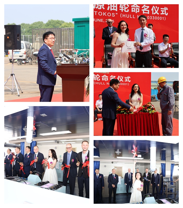 On 26 June, 2025, we held naming ceremony for one 299,500 DWT Crude Oil Tanker with Builder's Hull No.0330001. Our Executive Deputy General Manager Mr. Zhang Yuyong, General Manager Assistant Mr. Xu Zhenyu, Dynacom site manager Mr. Romeo Mustata, ABS  site manager Mr. Cao Wei and other VIP guests attended this ceremony.