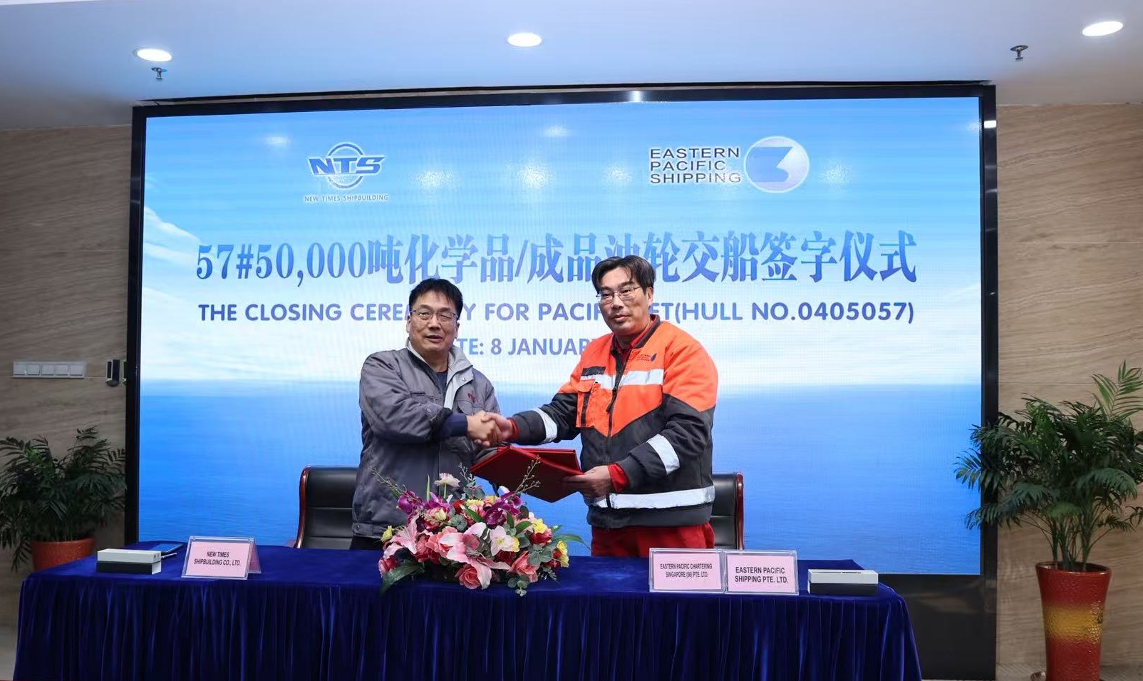On January 8, 2026, the closing ceremony for 57# 50,000 DWT Chemical/Product Oil Tanker bearing builder's hull no.0405057 was held in the meeting room on 8th floor of New Times Office Building. The company's Executive Deputy General Manager Mr. Zhang Yuyong, Deputy General Manager & Executive Director Mr. Yuan Heng and owner's representatives Mr. Ni Jie were present. The vessel was smoothly and successfully delivered by us and accepted by the Owner EPS.