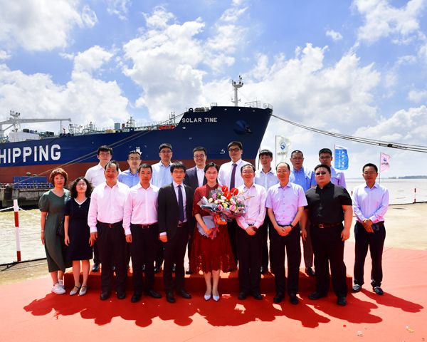 On July 23, 2021, the closing ceremony for 23# 50,000 DWT Product Oil/Chemical Tanker (IMO II Type) was held at the meeting room on 8th floor of New Times Office Building. Our CEO Mr.Liu Haijin, Executive Deputy General Manager Mr. Zhang Yuyong, Deputy General Manager & Executive Director Mr. Yuan Heng, Vice General Manager Mr. Xu Tao of Shandong Shipping Corporation and the representive from ICBC Financial Leasing Co., Ltd. attended this ceremony. The vessel was smoothly and successfully delivered by us and accepted by the Owner. On the same day, Godmother Mrs. Chen Jia'er named the vessel for "SOLAR TINE".