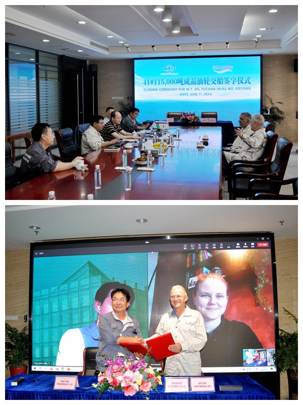 下午1:00,公司在八楼会议室举行船舶签字交付仪式,41#115000吨油船交付船东运营,该船的船东是挪威船东Frontline,总长249.9米,两柱间长245.2米,型宽44米,型深21.5米,设计吃水13.6米,结构吃水15.2米,载重115000吨,入LR船级社。FRONTLINE在我们公司共订制了船舶41艘,目前己交付了33艘。