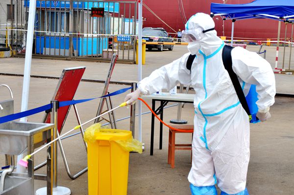 为了确保演练取得圆满成功,演练前,公司严格对照防控要求,制订了开放码头装卸作业新冠肺炎疫情防控演练预案,报请上级主管部门审批后进行实施。演练中,坚持“非必要不登船”要求,装卸作业人员从开始准备登船到装卸作业结束下船,全过程严格按照预案进行了实操演练:消杀人员对作业现场消毒,装卸作业人员从测量体温、正确穿戴防护用品、登船下船通过“三区两通道”严格执行了相关要求,整个过程规范、有序、细致、认真。