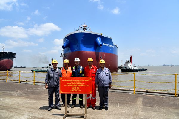 6月11日中午,新区3#坞区域,船舶下水工作如期开展,26#210000吨双燃料散货船、56#156500吨油船相继在海事拖轮的牵引下驶出船坞,停靠至船舶舾装码头,下水节点目标顺利完成。