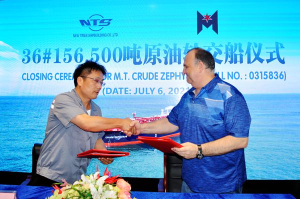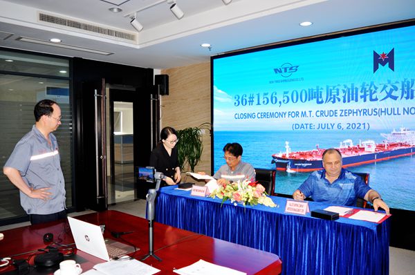 在大家的见证下,常务副总经理张玉永与希腊船东METROSTAR MANAGEMENT CORP.代表共同签署交船文本,名为“CRUDE ZEPHYRUS”的36#156500吨油船正式交付船东,这是本月交付的第二艘船舶。