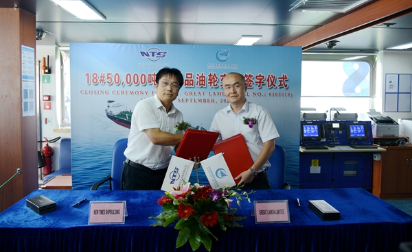 命名仪式结束后,观礼嘉宾们来到18#50000吨化学品/油船的驾驶室,共同见证常务副总经理张玉永与中航租赁公司副总经理李竣签署交船文本,整个活动的气氛在16名嘉宾共同剪彩中达到了高潮,18#船50000吨化学品/油船成功交付船东运营,19#50000吨化学品/油船也将在本月底交付。