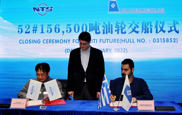 10日上午9:00,常务副总经理张玉永与建信金融租赁公司执行总经理尹海波先生、销售总监钮文珏女士共同签署33#156500吨油船交船文件;下午3:00,张玉永又与希腊船东AVIN INTERNATIONAL LTD代表签署了52#156500吨油船的交船文本,两船正式交付船东运营。