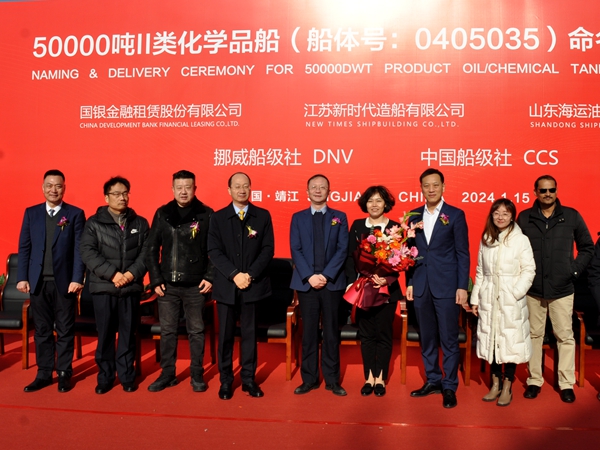 1月15日上午,35#50000吨Ⅱ类化学品船命名交付仪式在新区舾装码头隆重举行。