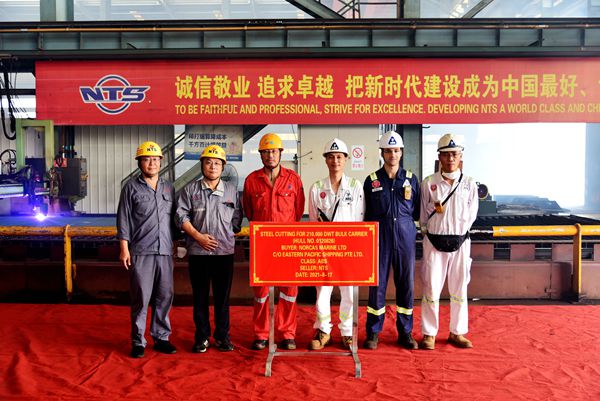 8月17日上午,常务副总经理张玉永与新加坡船东Eastern Pacific Shipping Pte. Ltd.(EPS)现场经理倪杰共同出席了26#210000吨散货船的开工点火仪式,该船船体结构件开始下料切割。