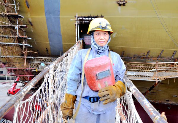孟秋艳同志走出船舶机舱