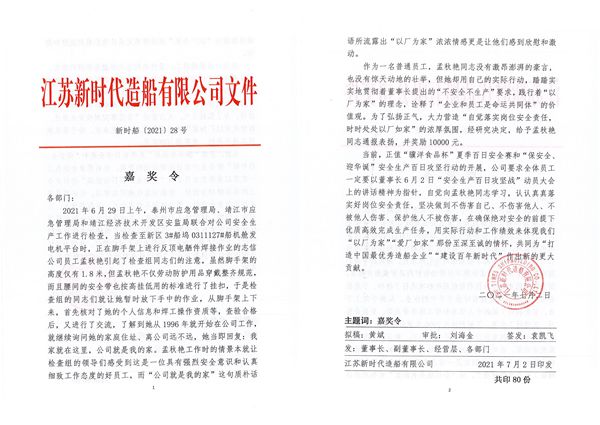 当前,正值“骥洋食品杯”夏季百日安全赛和“保安全、迎华诞”安全生产百日攻坚行动的开展,公司号召全体员工:一定要以董事长6月2日“安全生产百日攻坚战”动员大会上的讲话精神为指针,自觉向孟秋艳同志学习,认认真真落实好岗位安全责任,坚决做到不伤害自己、不伤害他人、不被他人伤害、保护他人不被伤害,在确保绝对安全的前提下优质高效完成生产任务,用实际行动和工作绩效来体现我们 “以厂为家”“爱厂如家”那份至深至诚的情怀,共同为“打造中国最优秀造船企业”“建设百年新时代”作出新的更大贡献。