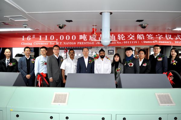 1月4日下午,公司在新建船舶16#110000吨成品油轮的驾驶室内隆重举行船舶交付签字仪式,16#110000吨油轮正式交付船东。