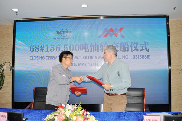 总经理刘海金、常务副总经理张玉永、副总经理朱韩钢、圣母吴婧女士与希腊船东NGM公司代表等嘉宾共同出席仪式。在友好的气氛中,常务副总经理张玉永与希腊船东NGM公司代表共同签署交船文本;圣母吴婧女士在新船旁掷香礼,祝愿新船在未来的航行中一帆风顺。