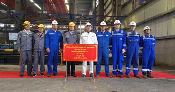 4月24号,公司举行了第三条325000吨矿砂船开工仪式,该船正式开工建造。公司的副总经理朱韩钢与韩国船东Pan