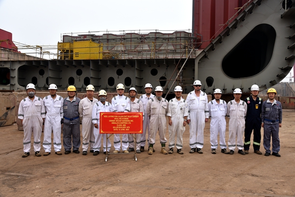 在鞭炮齐鸣中,39#40#210000吨双燃料动力散货船船体结构开始合拢搭载。该型210000吨双燃料动力散货船总长299.95米,两柱间长294.75米、型宽50.00米,型深25.20米,设计吃水18.40米,结构吃水18.48米,载重吨210000MT。