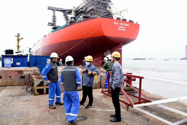 10月15日下午3:00,公司2#坞区域,5#325000吨超大型矿砂船有序开展船舶下水工作,随着海事拖轮缓缓发力,新船驶离船坞,顺利实现下水大节点。