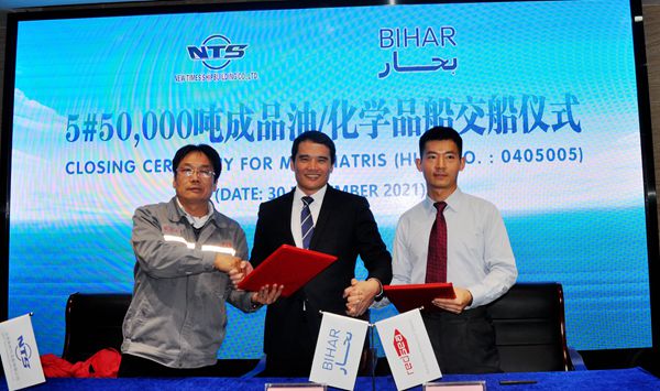 11月30日下午,公司在办公楼八楼会议室举行船舶签字交付仪式,5#50000吨化学品/油船顺利交付船东沙特BIHAR INTERNATIONAL COMPANY运营。