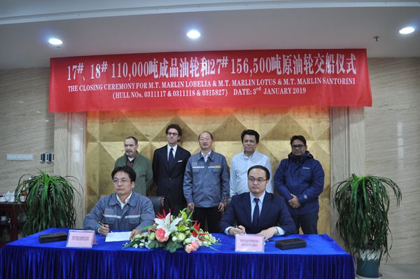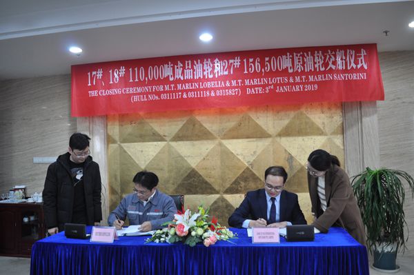 1月3日下午,公司在八楼会议室举行船舶交付签字仪式,总经理刘海金、常务副总经理张玉永与船东代表、船级社代表等嘉宾一起出席仪式。在大家的共同见证下,常务副总经理张玉永与船东代表分别在交船文本上签字,三艘船舶正式交付,迎来了新年的交船“开门红”。此次交付的船舶分别是17#18#110000吨成品油轮和27#156500吨原油轮。