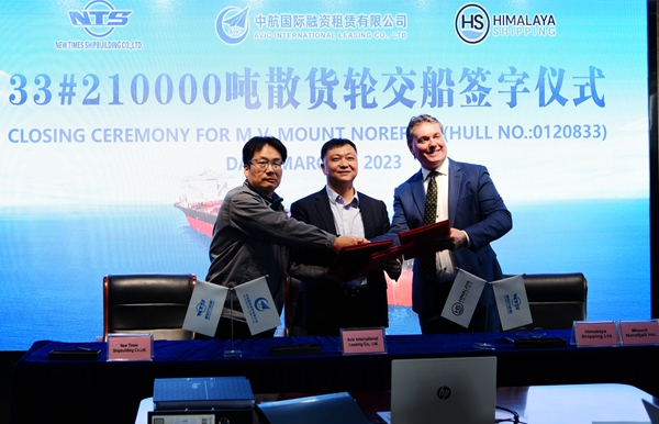 常务副总经理张玉永与船东Himalaya公司代表Jan Andersson、中航租赁航运子公司副总经理朱佳峰共同签署交付文本,总经理刘海金、副总经理袁衡、船东技术总监Olav Eikrem、现场经理Davor Radic、中航租赁航运子公司资产经营部副总经理秦珩、中航租赁航运子公司资产经营部副总监阮晓东、中航租赁航运子公司航运欧美市场部副总经理陈峥嵘等嘉宾出席活动,见证船舶成功交付。