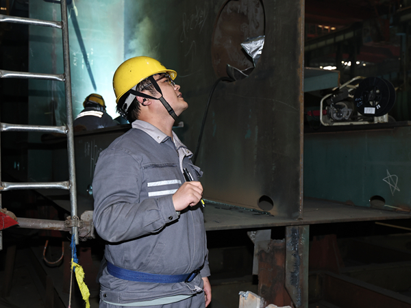 跨界转型,快速成长为生产骨干。张鹏同志毕业于徐州工程大学,曾从事建筑业项目经理工作,具备扎实的管理基础和强烈的责任担当。2024年10月,他怀着对造船事业的向往,跨界加入我们公司,现任分段制造部主管,负责2#车间G3跨生产管理工作。初入造船行业,张鹏深知分段制造对专业能力的严苛要求。为尽快胜任岗位,他白天扎根现场熟悉每一道工序,晚上钻研工艺标准和操作规范,遇到难题虚心请教。正是凭借这份韧劲,很快从业务新手成长为独当一面的生产主管。师傅丁凯说:“日常工作中,张鹏始终秉持‘事事有落实、件件有回音’的工作准则。面对工期紧、任务重的生产常态,他坚持每天提前到岗梳理计划,扎根现场协调解决堵点难点,用实干保障进度,用行动赢得信任。”