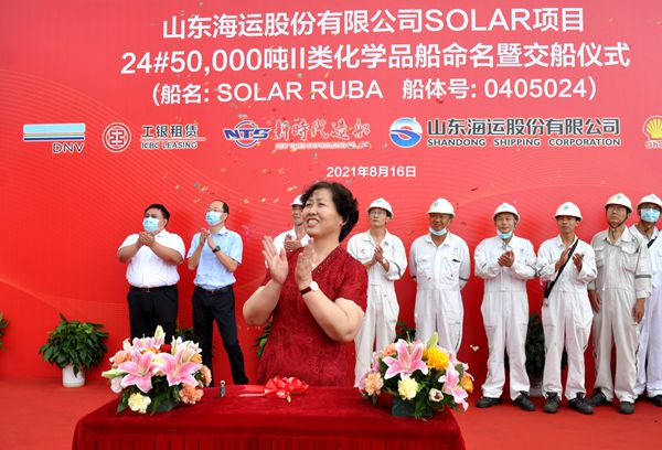 在办公楼八楼会议室,常务副总经理张玉永与山东海运副总经理徐涛及工银租赁代表通过“云交付”方式,一起签署了交船文本;签字结束后,总经理刘海金、教母黄银芳女士等嘉宾一起来到西区舾装码头,参加船舶命名仪式。教母黄银芳女士将24#50000吨化学品油船命名为“SOLAR RUBA”号,并祝愿她在未来的航程中乘风破浪,航行顺利;顺达货满,船员平安启归。仪式结束后,总经理刘海金又与参加活动的嘉宾们一起参观了新船。
